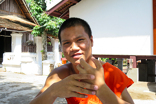 境内で本を広げている若いお坊さんに声をかけると、『私はノービス(Novice)のボーンタン(Bounthan)と言います。』と自己紹介してくれた。