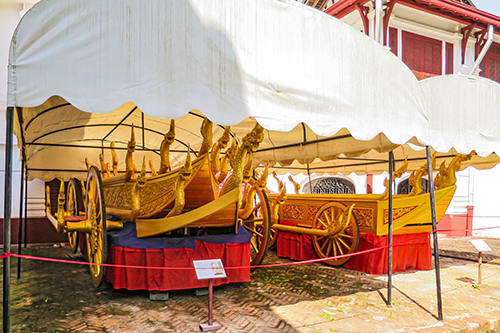 本館正面石段を下りて左に回ると、本館裏手に未だ新しい船の形をした山車がテントの下に陳列してあった。ルアンパバーンの祭りにでも使うのだろう。