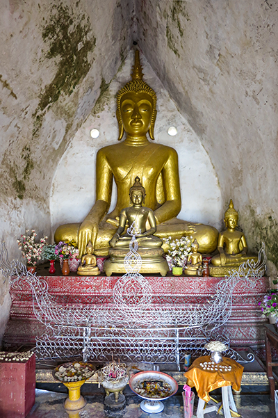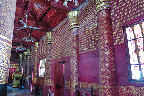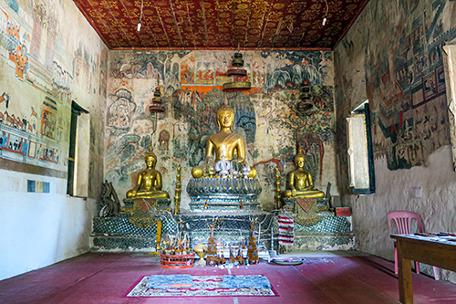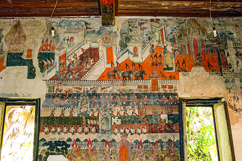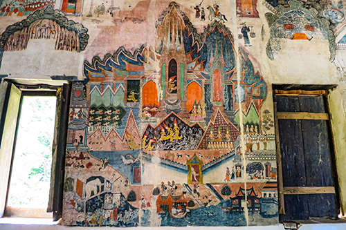 本尊内の両側の壁にはメコンの歴史を描いたといわてれる19世紀の壁画が、傷みの激しいまま残っている。