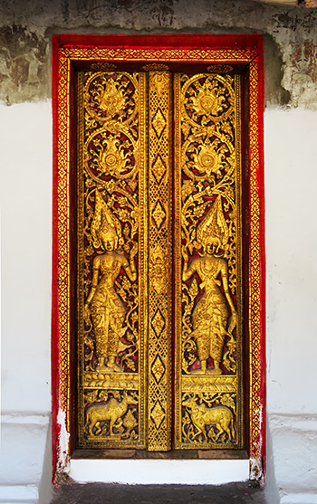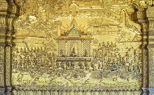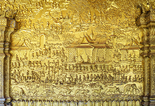 インドのラーマーヤナをモチーフにして、仏教の輪廻を表す本堂正面の壁に施された金色のレリーフは一見の価値あり。