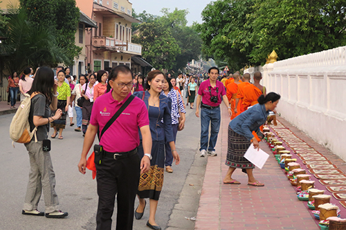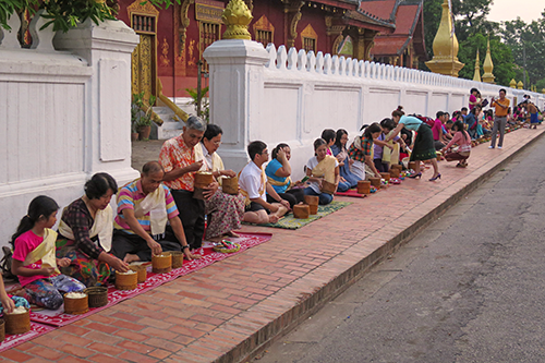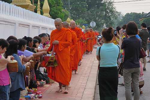 托鉢の僧は並んで座っている人達から一人一人竹籠に入ったカオ・ニャオ(ラオスの主食・蒸したモチ米)や供物を受け取りながら、ゆっくりと街の中心に向かって進んでゆく。
