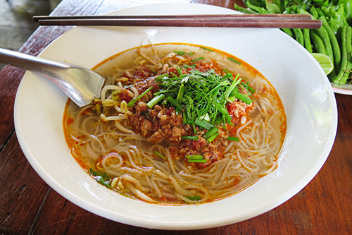 托鉢僧を見送ってから宿の隣のラオ麺屋で今朝は辛い挽肉味噌が載ったカオ・ソーイで朝食、20,000Kip(約302円)。