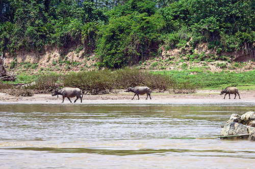 河川敷をノンビリ歩く三頭の牛、角の形から察するに水牛だろう。野生なのか家畜なのかは分からないが、一番後からついて行く一頭は前を往く二頭の子供か?