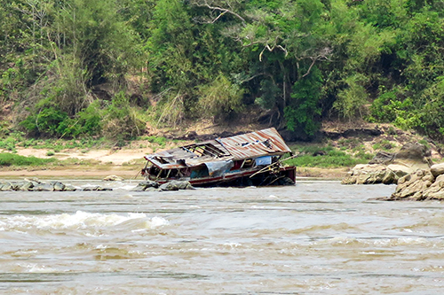 往きには気づかなかったが、崩れた岩にぶつかって大破したと思われる船が川に浸かったまま放置されていた。