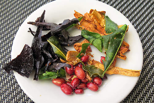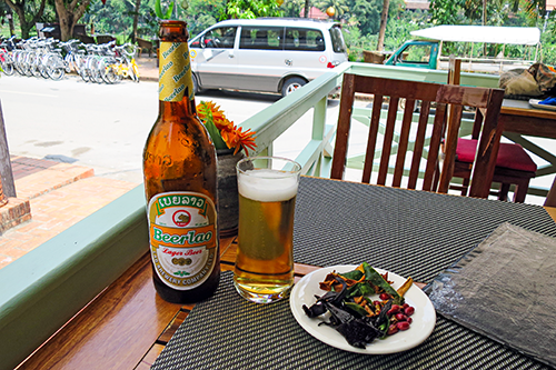 見たことのないツマミだが、メニューには "Unusual, flavorsome Lao nibbles and crisps" とあるだけ。「ラオスのカリカリ・ポリポリ珍味」とでも言えばいいのだろうか、ピーナッツ以外はパリパリに乾燥させてあり、ビールにピッタリ。特にパクチーのような葉の燻製が好かった。
