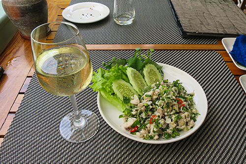 白ワイン 30,000Kip(約453円)と魚のサラダ(Fishes Salad/Koy Pa) 45,000Kip(約680円)を頼む。