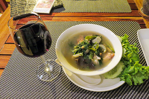 ランチの白も好かったが、グラスで頼んだこの赤ワインも銘柄は分からないががなかなか好い。ビエンチャンでもワインの好さを感じたが、かつてのフランス統治の影響だろう。