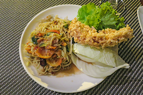 甘酢味のドレッシングがかかったパパイヤ・サラダ、スライスされたパパイヤがパリパリした食感でお腹によさそう。付け合わせの大きなオコシ風は揚げたカオ・ニャオのようだ。