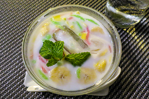 デザートのナム・ナームは甘いココナツ・ミルクにバナナとパイナップル、赤と緑の正体不明のアクセントが入り、トッピングはミント。甘かったが完食。