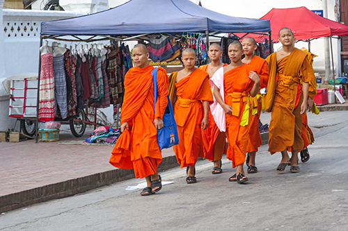 ナンプから宿に向かって夜店の準備が進むシーサワンォン通りを歩き始めると、少年修業僧たちがグループで歩いてくる姿に出会う。