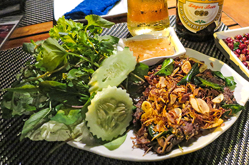 頼んだ "Barbecued Marinated Buffalo (Ping Sin Kwai)" 55,000Kip(約830円)はバッファローとあるから水牛の肉だ。マリネして焼いた肉、トッピングに揚げたニンニク・チップがたっぷりのっている。香辛料が利いた肉汁タップリの軟らかい水牛、美味かった~。