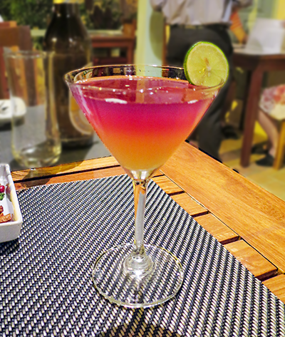 たっぷりした大きなカクテル・グラスの紫色からオレンジ色へのグラデーションがきれいなカクテルだ。見かけによらず焼酎(ラオ・ラーオ)の味がそのままのワイルドなカクテルだった。