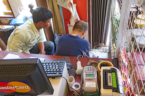 | 決済端末の回線を調べるオーナーと、それを見守る店長。 |