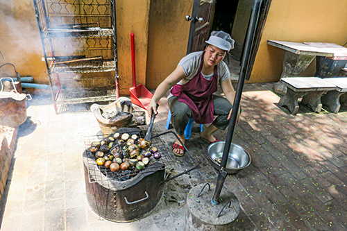 | ジャガイモを焼いているように見えるがアミの上は茄子。 |