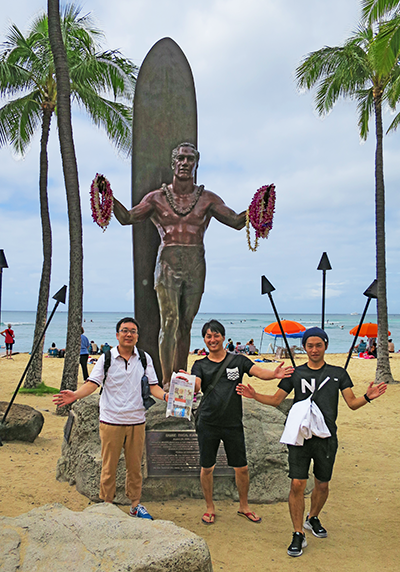 | デューク・カハナモク像と西田・坂上・八島の諸兄。 |