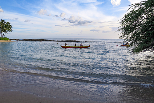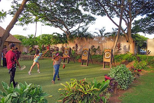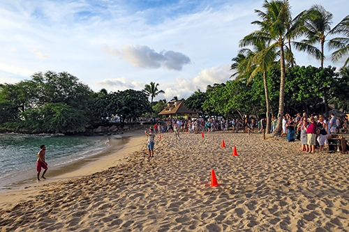 プライベート・ビーチでカヌーを漕いだり、的に当たっても当たらなくても手製の可愛い貝殻のネックレスがもらえる槍投げに興じたり、見事な夕日とタップリのハワイアン・カクテルを楽しんだりと盛りだくさん。
