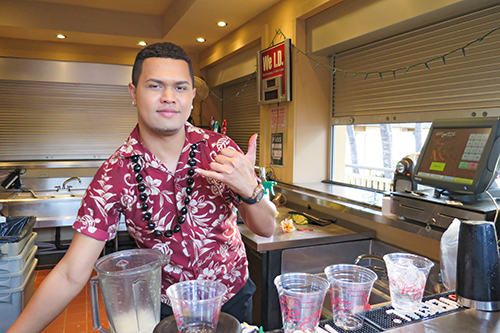 | 園内に数か所あるカクテル・コーナーのバーテンダー君。左手は『アロ~ハ』のサイン。 |