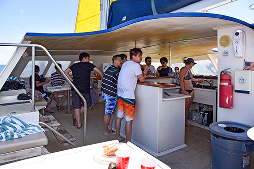 | アルコールの提供はスノーケリング後と言われ、物欲しげな面々。 |
