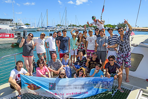 | 港に戻って船上で記念撮影。 |