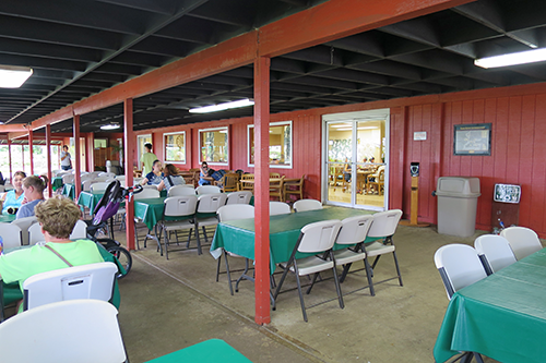 今朝、アトラクションのスケジュールが配られたテラス右側のガラス戸が食堂の入り口。