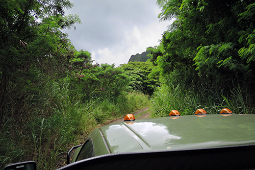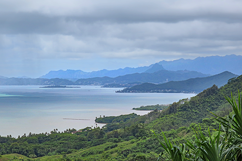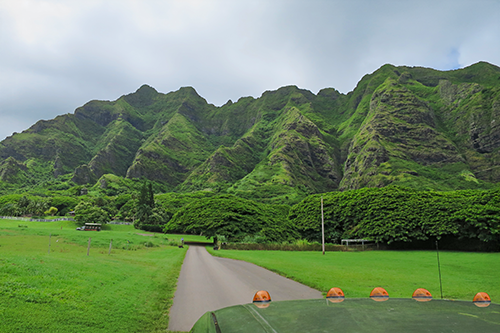 山の中に入り開けたところに出ると、午前中のクルージングで波をかぶったカネオヘ湾とチャイナ・マンズ・ハット島が見えてきた。