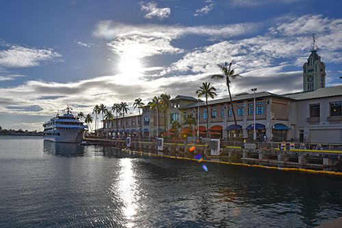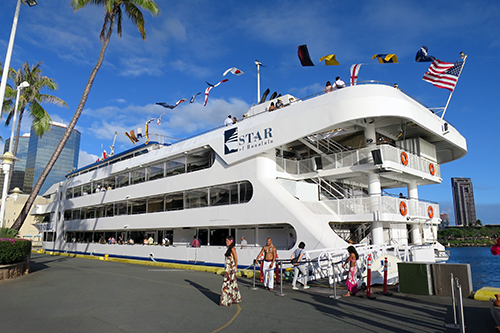 マーケットプレースの前、ピア8に停泊している船「Star Of Honolulu 号」がスリー・スター・サンセット・クルーズの船。