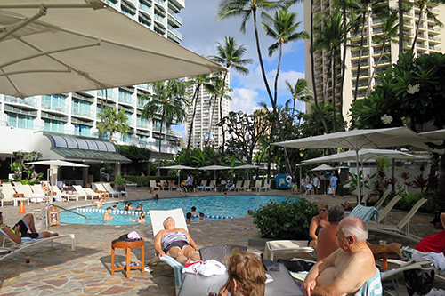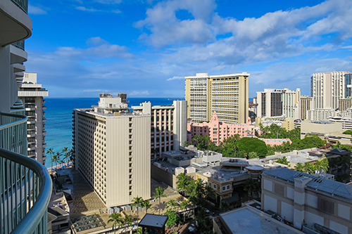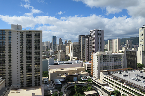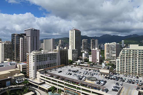 | 南西の方角はワイキキビーチ。トキ色の建物はロイヤル・ハワイアン・ホテル。 |