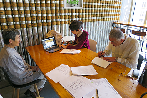 | 会場で打ち合わせ中の小宮山さんご夫妻。今本さんは通訳役。 |