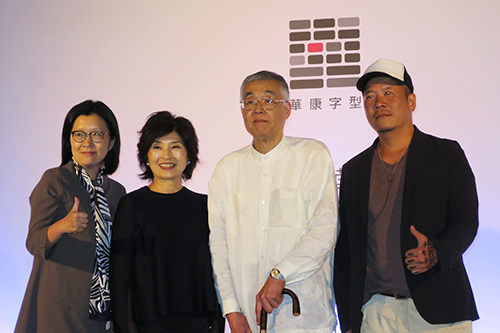 | 記念撮影で壇上に並んだ王馥蓓さん、Amyさん、小宮山さん、蕭青陽さん。 |