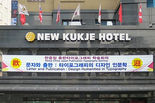 ホテルの壁には「韓中日出版タイポグラフィー・セミナー」を歓迎するバナーが掛けられていた。