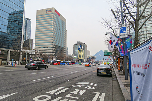 | ニュー国際ホテル前の世宗大路。奥に北岳山が見える。 |