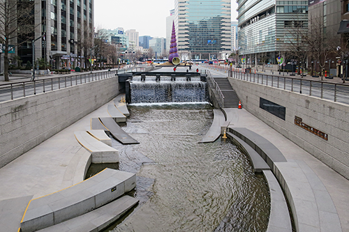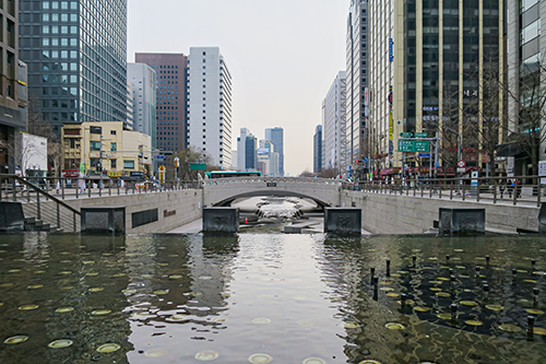 東亜日報の前で右折すると清渓川路で文字通り真ん中に清渓川が流れている。