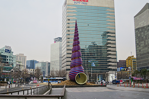 清渓川の出発地点、清渓川広場に巻貝のようなモニュメントが建っているが由来は何なのだろう? インターネットの情報によれば清渓川復元一周年を記念して設置された「スプリング」と題されたオブジェ。