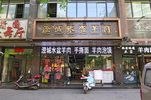 シャッターを開けたばかりの店先から盛大に湯気を上げている店に、次々と地元の人たちが吸い込まれてゆく。入り口に掲げられた看板には「東府小揚 澄城水盆羊肉」とある。