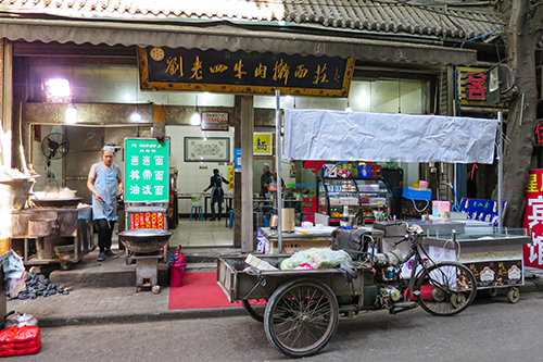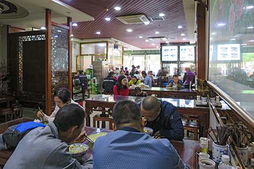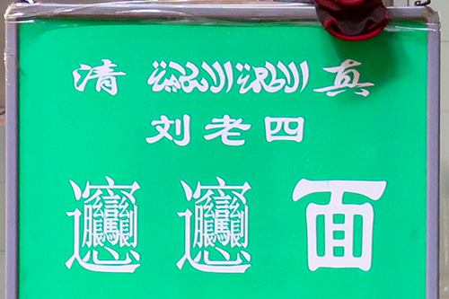人混みの切れ目で「劉老四牛肉擀面荘」と看板の掛かった食堂の中に緑色の看板が目についた。
