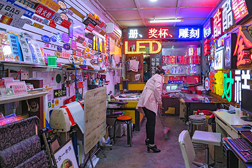 開けたばかりの店内に缶バッジやLEDのサインが並んでいる。消火栓、配件庫、奨杯、彫刻などのサインが赤く青く店内を照らしている。