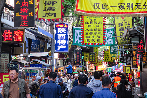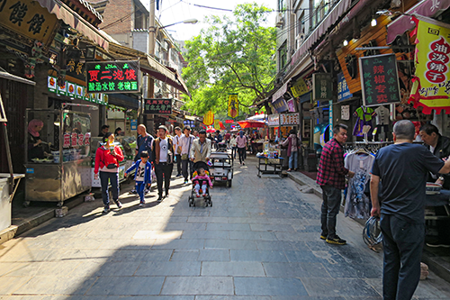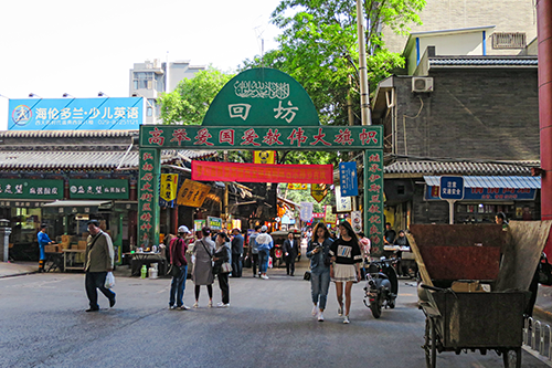 行き交う人たちの中に、頭に丸くて上が平らな帽子を載せた男性や、被り物でスッポリと髪を包んだ女性の姿を見かけるが回族の人たちだ。周囲に飛び交う言葉は回族訛りの中国語のようだ。