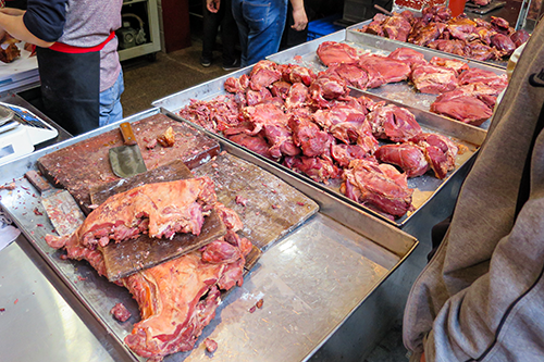 大きな塊のまま燻製した肉を売る「劉紀孝腊牛羊肉店」の一角にできた行列は一向に短くならない。この肉をビールのつまみにしたら旨いだろうな!