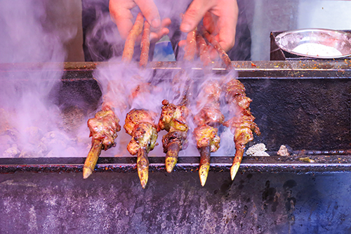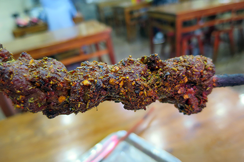 店先では羊肉の串焼きが煙と共に旨そうな匂いを振りまいている。肉を刺しているクシが北京や上海で見てきたクシとは違って木の枝の先を尖らせた太いクシだ。