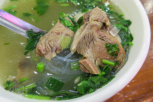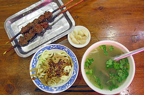 ビャンビャン麺15元(263円)、紅柳の枝を使った烤羊肉2串20元(350円)、羊杂湯28元(490円)。