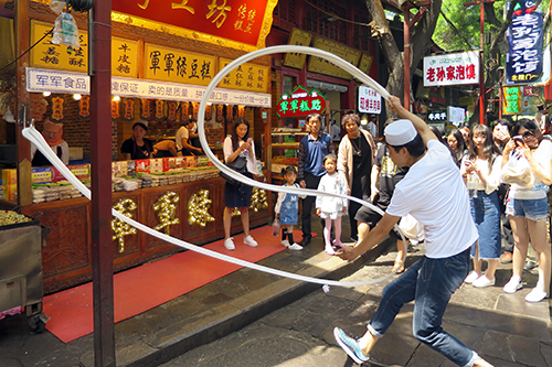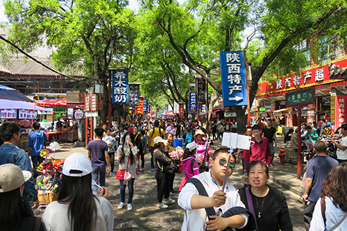 4月27日┃4月28日┃4月29日┃4月30日┃5月1日 5月2日┃5月3日┃5月4日┃5月5日┃5月6日┃地図 回坊│清真大寺│北院門街(回坊風情街)│高家大院│鼓楼│鐘楼 【4月28日(金)晴】鼓楼 北院門街(回坊風情街)に戻り左右の土産物店や食堂の様子を眺めながら鼓楼を目指して南下。