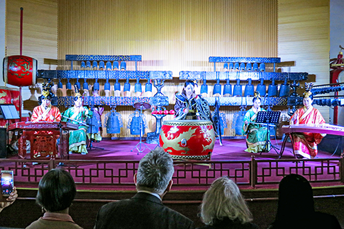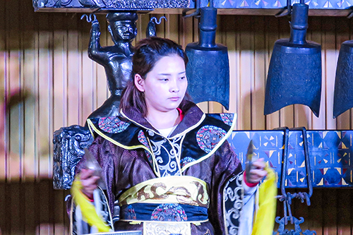 鼓楼内に設けられているステージでは中国の伝統音楽の演奏が始まった。演奏者を見ると全員女性、音楽大学生なのだろうか。身につけている衣装は秦朝から漢王朝(紀元前221年 - 西暦220年)の頃の様式のようだ。
