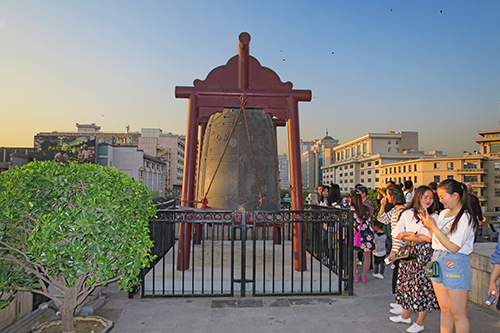 西の角に設置されている現在の鐘は重量5トンだが、景雲鐘よりも小さい。