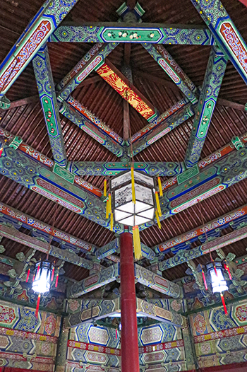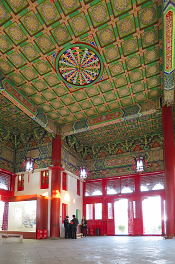 | 鐘楼一階の見事な彩色の格子天井。 |