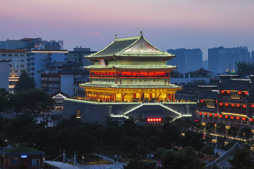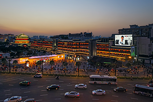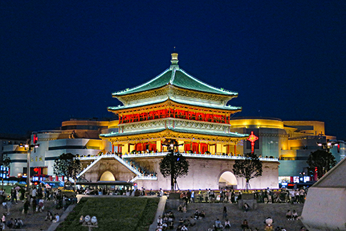 日が落ち始めて鐘楼向かいに見える鐘鼓楼広場と鼓楼を飾る明かりが灯る。