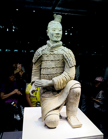 弩(いしゆみ)を持って跪く弓手。二号坑東北角で発見された方陣を組む弩部隊160体の内、部隊の中央にあった一体。