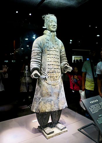二号坑の一角にはここで発掘された兵士俑のレプリカがガラス・ケースに入れられて陳列されている。ガラスケースの周囲にできたカメラを構えた見学者の壁はいつまで経っても無くならない。