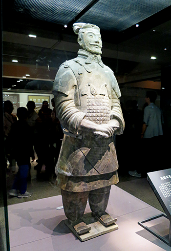 長身のこの俑は身に着けた雉の尾の帽子、二重のコートが、明らかに高級将校であることを示している。発掘された七体の高級軍吏俑の内の一体。