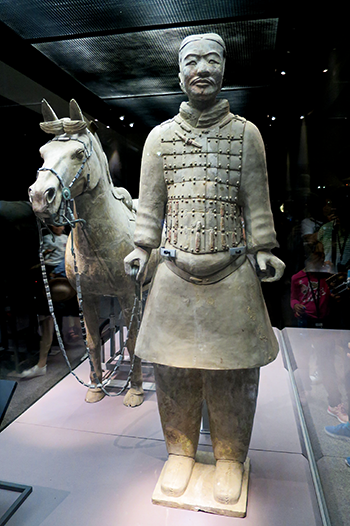 ここには弓を持った歩兵隊、戦車隊、歩兵・戦車の混合隊、騎馬隊の四部隊、その総数は歩兵562体、騎兵と騎馬116組み、戦車89両と馬336体があり、一号坑、三号坑と併せて秦軍の構成が忠実に再現されいるという。