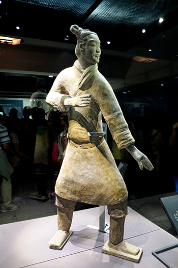 弩を構える軽装の歩兵。二号坑東北角で発見された方陣を組む弩部隊の外側から発掘された172体の内の一体。